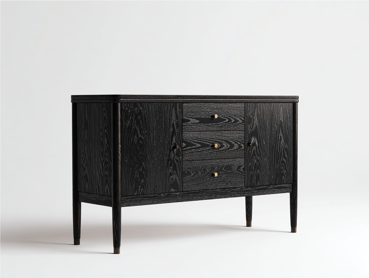 Constructed from wood-based panels with a black wood-grain finish, the cabinet delivers a refined and textured appearance. Metal accents are used for the handles, adding subtle contrast and durability. The structure is supported by sturdy legs that enhance stability and elevate the overall design.