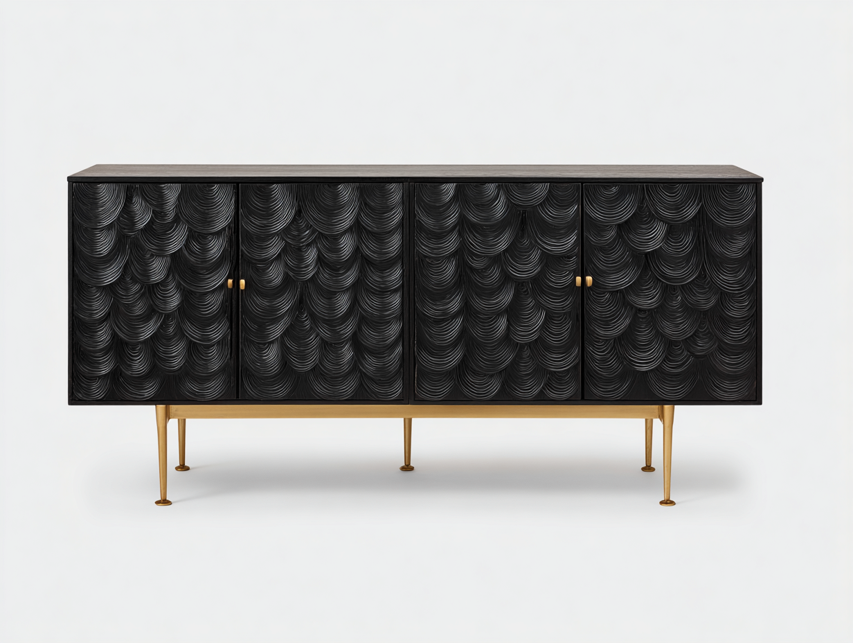 This entryway cabinet combines bold textured detailing with generous storage capacity, making it a striking addition to entryways, living rooms, or hallway spaces. Its elongated structure enhances both functionality and visual balance in contemporary interiors.
