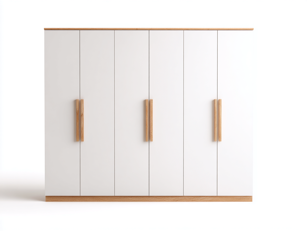 The wide structure offers extensive enclosed storage, making it suitable for organising garments and larger items. The vertical door layout allows easy access, while the natural wood details add warmth to the overall appearance. Its stable base ensures reliable daily use.